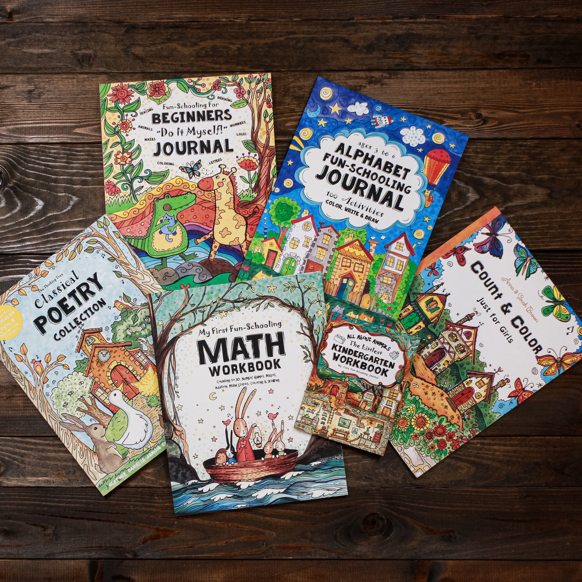 - Alphabet Fun-Schooling Journal (Ages 3-6): Teaches letter sounds, handwriting, and phonics through coloring, tracing, and drawing.